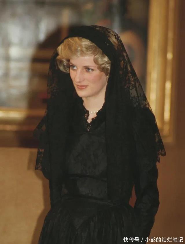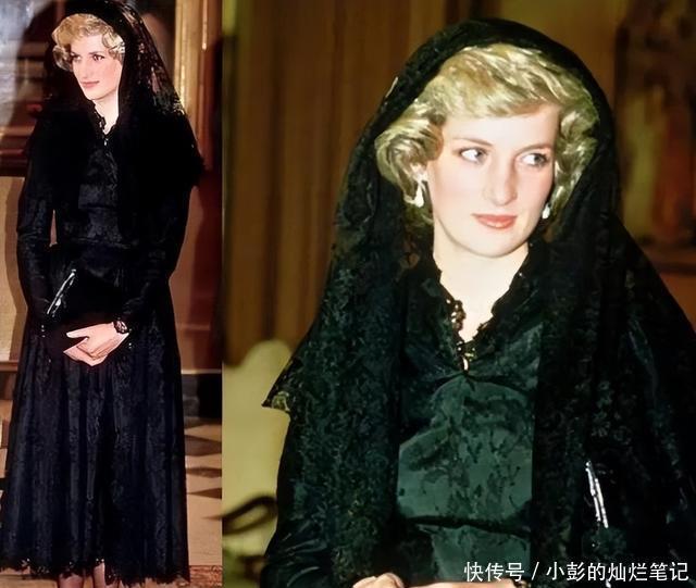同样的黑色头纱,不同的是戴安娜选择了蕾丝款的织花头纱,不长,如同黑色纱巾罩于她金发的短发上,同样配黑色的裙子,可衣服收腰,修身,让她原本就无可挑剔的身材越发完美。