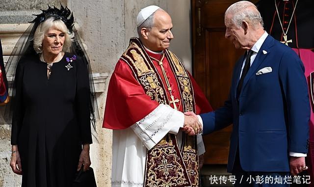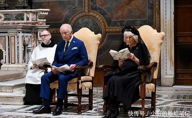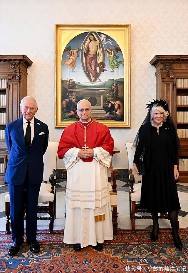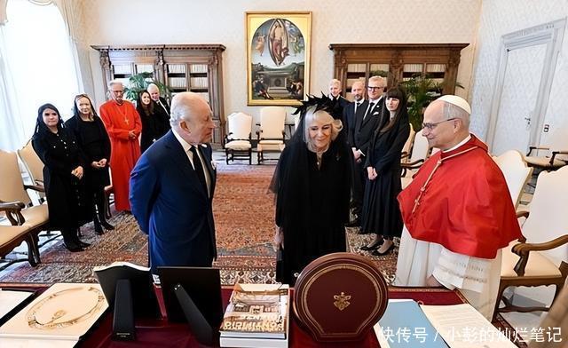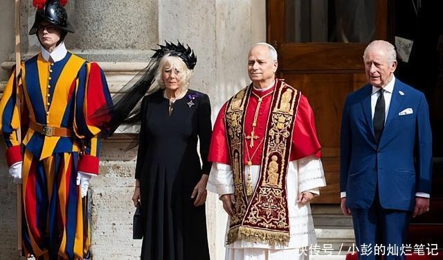 23日,查尔斯带着自己的王后卡米拉到达梵蒂冈,78岁的卡米拉王后着一套黑色套裙配黑色面纱觐见教皇。