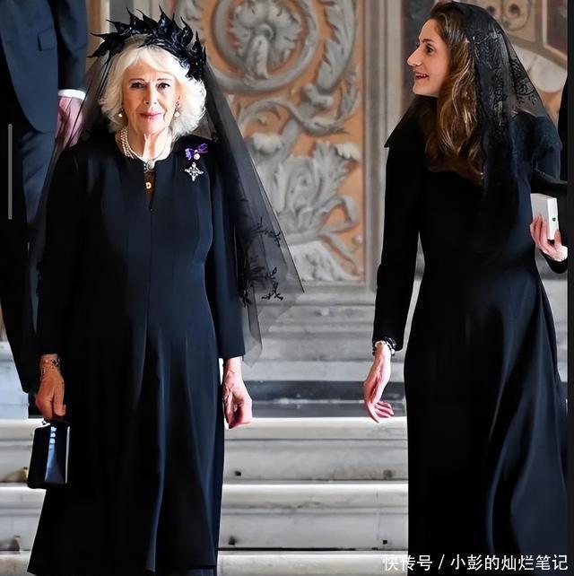 头上的黑纱更有来头,来自菲利普·特雷西曼蒂拉,这是很多王室女性都向往认可的面纱品牌,不仅昂贵,而且身份都摆在那里。 只不过,卡米拉相当大胆,一把年纪不想太普通,竟然在一头白发的情况下, 选择了带有立体叶子的款,黑纱足够长,叶子足够大, 看上去像婚纱上的配饰,只不过为黑色。